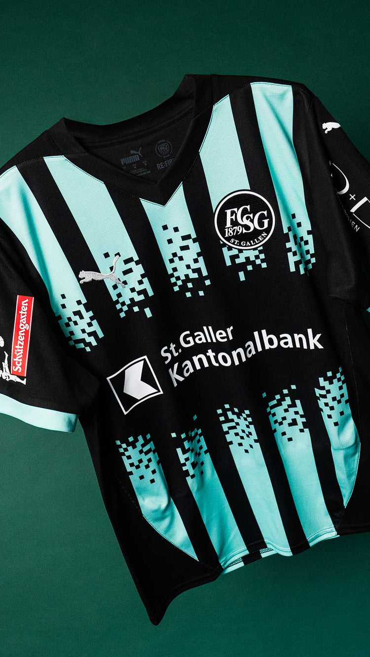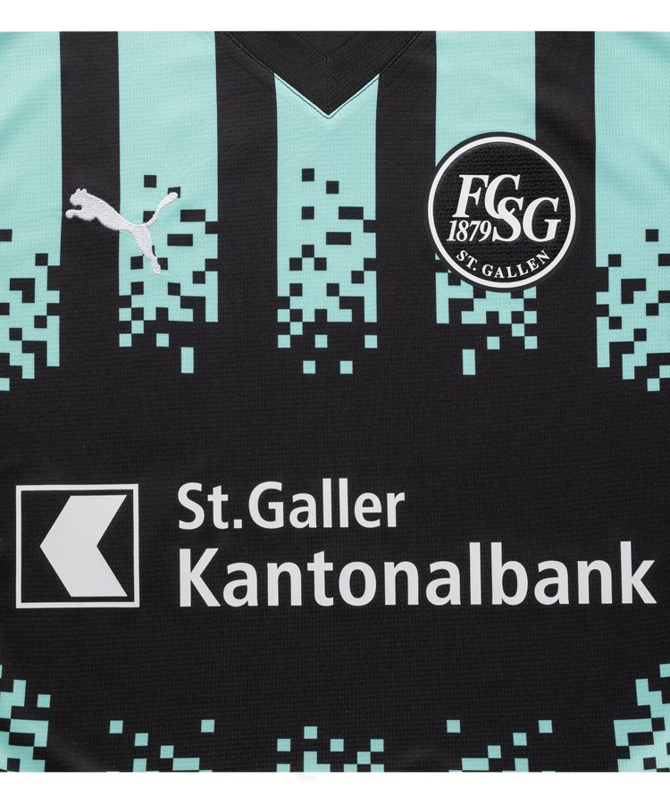 Das Away-Trikot der Saison 2024/25 ist etwas ausgefallener als die Heimvariante. Es sticht mit verschiedenen mintfarbenen Pixelstreifen auf schwarzem Grund hervor. Wie beim Heimtrikot symbolisieren die Pixel Bausteine. Wenn wir alle zusammenhalten, können wir Grosses erreichen. Wir alle sind der FCSG! Hol dir jetzt dein Trikot und werde Teil unserer grossen Geschichte!
