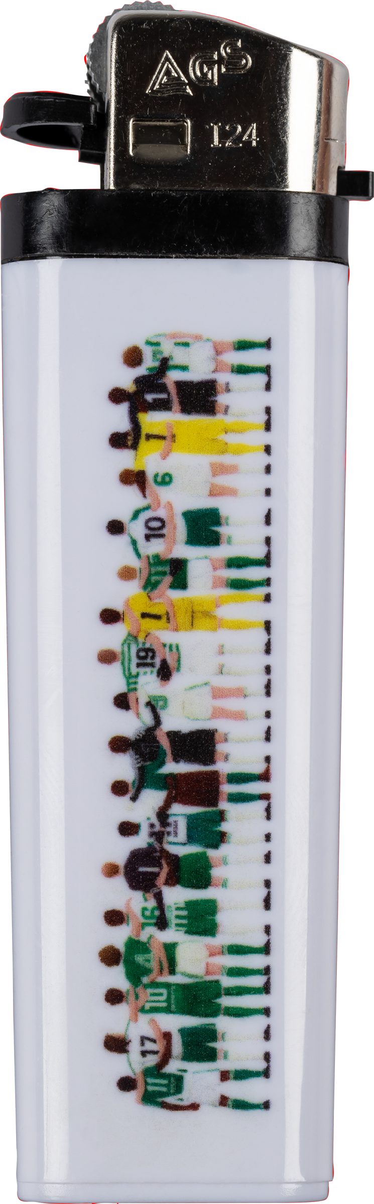 Zämä sind mir Sangallä! Das praktische Feuerzeug mit berühmten Spielern aus der bewegten Geschichte unseres FCSG passt in jede Hosentasche und entzündet Feuer wie die Espen auf dem Platz.