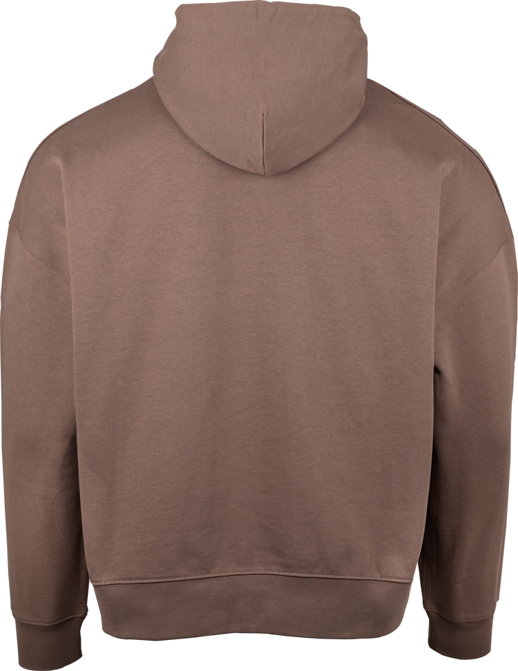 Dezenter brauner Hoodie mit gesticktem Schriftzug und gewobenem Regions-Label auf der Rückseite - ideal für Schule, Job oder Nachtleben!