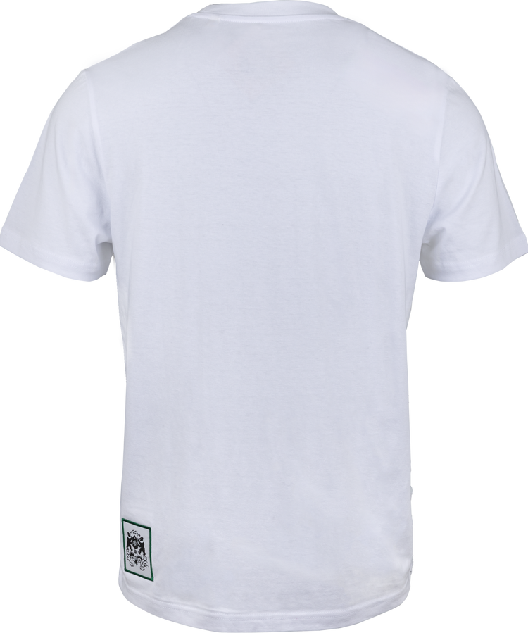 Schlicht und ergreifend: ein weisses Bio-Baumwoll-Shirt mit dem gestickten Emblem unserer beiden Stadien auf der Brust und dem Wappen der Fussballregion als Badge auf dem Rücken. In der EU hergestellt.