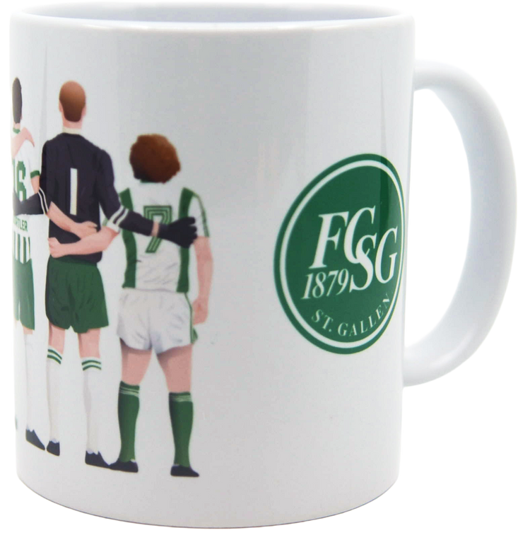 Zämä sind mir Sangallä! Hochwertige, weisse Porzellantasse mit berühmten Spielern aus der bewegten Geschichte unseres FCSG. Erkennst du sie alle?