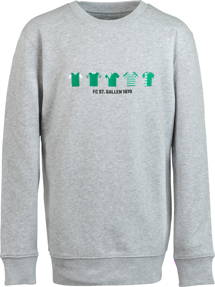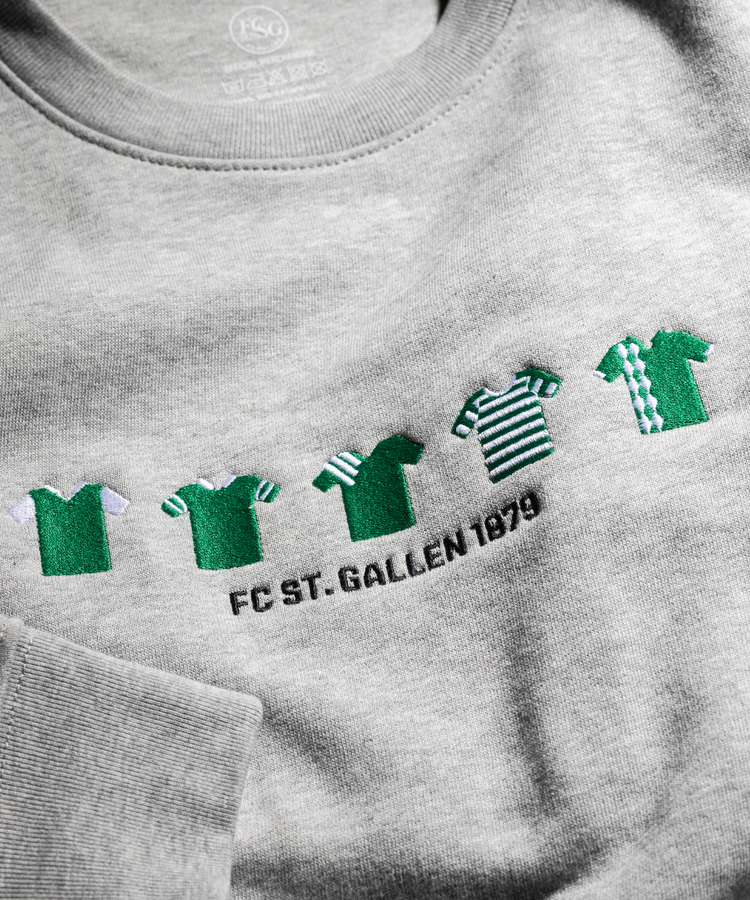 Legendäre St.Galler Trikots, eine kleine Auswahl - wer erkennt sie? Das hochwertige Sweatshirt besteht aus Bio-Baumwolle und recyceltem Polyester, wurde in der EU gefertigt und das Motiv ist aufgestickt.